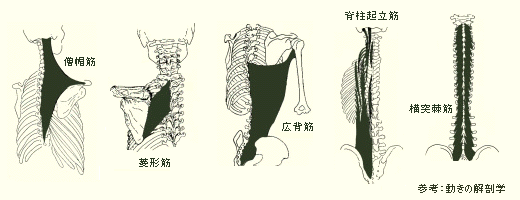 長時間の悪い姿勢や疲労放置などから僧帽筋・菱形筋・広背筋・脊柱起立筋・横突棘筋等が緊張して収縮・硬化することにより、筋肉内の血管や神経を圧迫し痛みとなって現れてきます。
