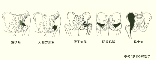 長期に渡る偏った姿勢や疲労放置などから梨状筋・閉鎖筋・双子筋・大腿方形筋・腸骨筋等が緊張して収縮・硬化することにより、股関節に歪みが生じ、血管や神経を圧迫し、痛みとなって現れてきます。