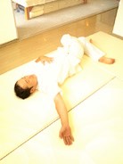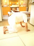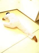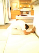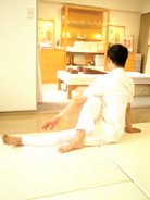 正座の形から片足を伸ばし、曲げているほうの足はかかとをお尻の外に出し、お尻を床に付け両手を後につきましょう。出来れば、両ひじをついたり寝そべってみましょう。左右やりましょう。