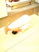 仰向けになり足を把持し頭の方へ近付けて行きます。ひざを曲げて外に開いても構いませんが、出来ればひざを伸ばしたままやりましょう。足を持つ手はしっかり組んでやりましょう。