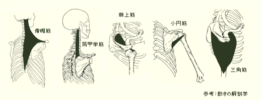 長時間の悪い姿勢や運動不足、疲労放置などから僧帽筋・肩甲挙筋・棘上筋・小円筋・三角筋などが緊張し、収縮・硬化することにより、筋肉内の血管や神経を圧迫し、痛みとなって現れてきます。
