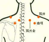 ■ 肩こり ■ 細かい作業に集中したりすると、無意識に肩に力が入った ままになり、肩が凝ってきます。首を前に倒して腕を大き く回したり、肩を意識的に下げたりしましょう。 また、肩 にあるツボはもまずに温圧しましょう。 【肩井 (けんせい)】 首の後と肩先の中間付近。 【肩外兪 (けんがいゆ)】 肩甲骨の上部と背骨の間。 【曲垣 (きょくえん)】 肩甲骨内縁の上際。 【手三里 (てさんり)】 曲げた肘の内側にできるシワの親指側から指3本位下。 【支正 (しせい)】 腕の外側の小指側で、骨に触れる所の手首と肘の中間。 |