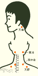 ■ 首の凝り ・ 痛み ■ 損傷や炎症の場合を除き、多くは首の筋肉が疲労により 硬化し血流が悪くなることによって生じる痛みです。 蒸しタオルなどで 首を温めながらツボを指圧しましょう。 【天傭 (てんよう)】正しい部首は「イ」ではなく「片」 耳の後の飛び出た骨のすぐ後の窪みから指2本ほど下。 【風池 (ふうち)】 髪の生え際にある左右の窪み。 【肩中兪 (けんちゅうゆ)】 首の付け根の一番高く出る骨のすぐ下から指3本横。 【天膠 (てんりょう)】正しい部首は「月」ではなく「骨」 肩甲骨の内側上端から指2本ほど上の硬い筋肉の上。 |