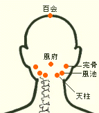 ■ 頭痛 ■ 頭痛の原因は様々ですが、いずれも血管の拡張や収縮 によって起こります。脳が酸欠状態の時は血液を多く必要 とすることから血管が拡張し、寒い状態が長く続くと血管は 収縮します。 後頭部や首のツボをゆっくり静かに指圧しま しょう。 また、暑さでのぼせた時などは頭や首や脇の下を 冷やしましょう。 【風池 (ふうち)】 髪の生え際の左右の窪み。 【風府 (ふうふ)】 髪の生え際の中心から親指一本ほど上の窪み。 【完骨 (かんこつ)】 耳の後の骨から髪の生え際に向かった所にある窪み。 【天柱 (てんちゅう)】 髪の生え際の風池から若干下の頚椎寄り。 【百会 (ひゃくえ)】 左右の耳たぶを結んだ線の中心。頭のてっぺん。 |